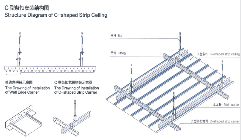 C型條扣采用進口專用烤漆龍骨,簡單易于維護和保養的鋁合金條闆組合成平整密閉式結構,便于清潔;多模數闆寬可任意組合,爲現代建築提供更多的設計意。