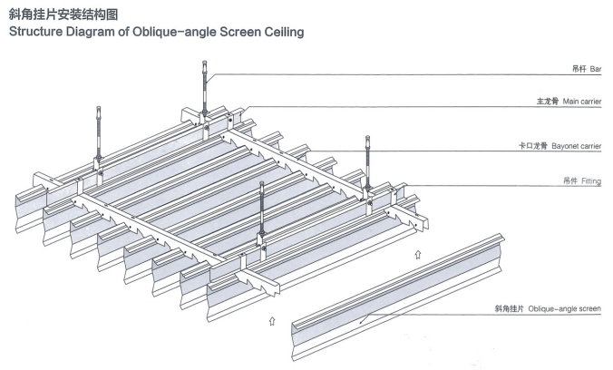 挂片天花采用單向條闆安裝,形成單向屏級視覺;線條明快票逸,選用适當的高度,以适當視覺角度,能産生幕布效果;其維修限制較少,令設計變化萬幹,整個建築空間寬暢通透。